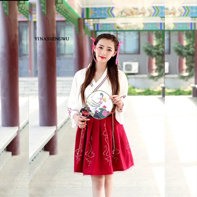 Hanfu Costume Dress Women Improved Hanfu Daily Short Sleeve Hanfu Embroidered Crossdresses Costumes Han Elements Student Set USD 18 piece /lot 1