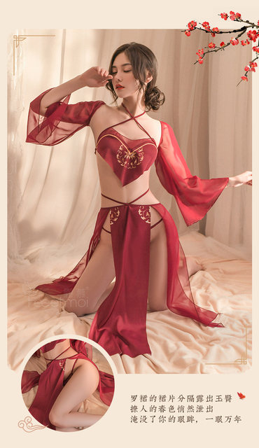 Chinese Red Hanfu Uniform Antique Sexy Temptation Pajamas Apron Women Bellyband Lingerie Uniform Hot Pajamas Slit Skirt Set
